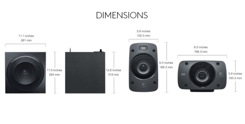 Размери, mm:Satellites: 100.3 x 166.3 x 93.5 mm, Subwoofer: 281 x 293 x 319 mm, Center Channel: 166.3 x 100.3 x 93.5 mm, Control Console: 293 x 281 mm, Wireless Remote: 43 x 111 x 18.9 mm
