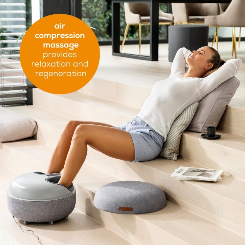 Масажор Beurer FM 120 Shiatsu foot massager + modern stool; Shiatsu and air pressure massage; Heat function; 3 massage programmes; 3 intensity levels of air compression massage; shoe size 46; washable and removable cover; wireless control