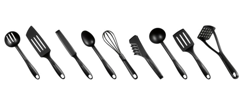 Вид:The set includes:whisk, potato masher, spoon, spatula, ladle, slotted spoon, tongs