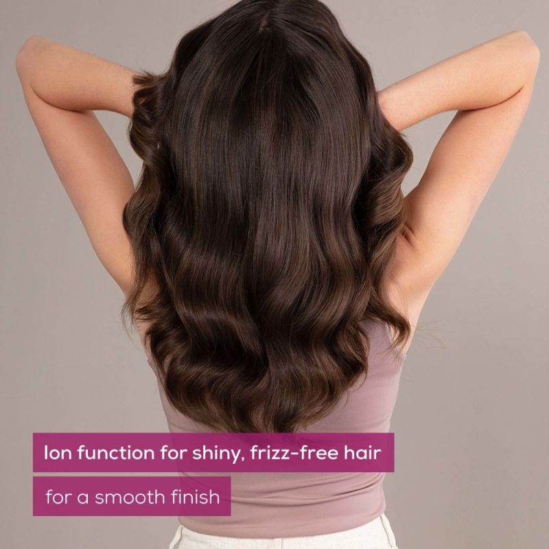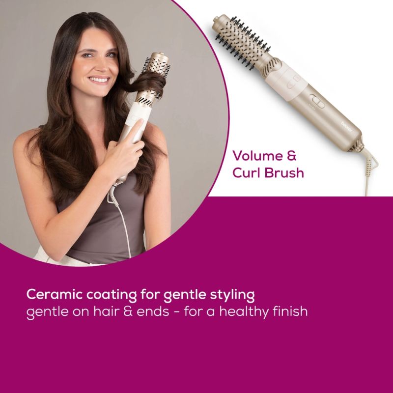 2 exchangeable attachments: Curling brush: soft, sleek curles and waves; Volume brush: volume and fill