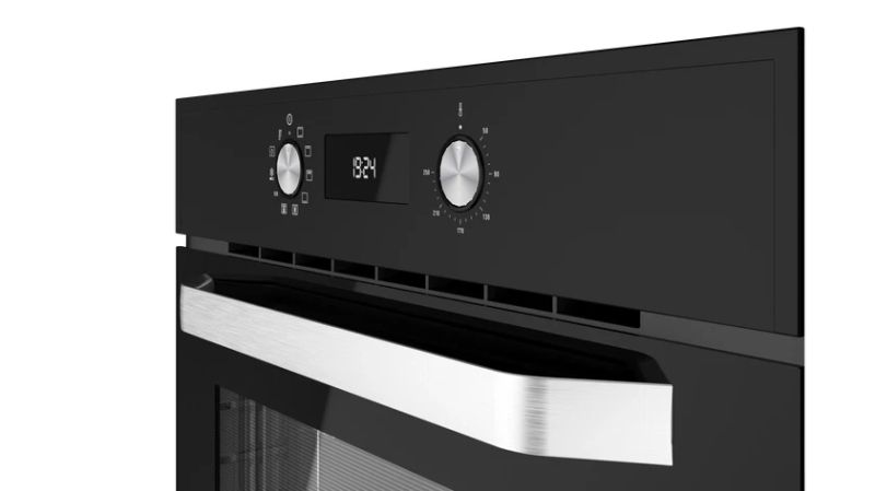 Двойното стъкло на вратата запазва топлината вътре, а вентилаторната система за охлаждане предпазва корпуса и мебелите около фурната.