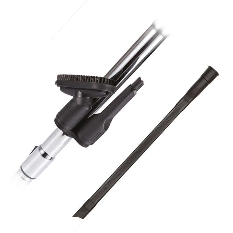 Телескопичната метална тръба и гъвкавият маркуч осигуряват удобство при работа и лесен достъп до труднодостъпни места. В комплекта са включени универсална четка за подови настилки, приставка за мебели и накрайник за тесни пространства, което позволява ефективно почистване на различни повърхности и зони в дома.